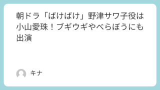 芸能 朝ドラ「ばけばけ」野津サワ子役は小山愛珠!ブギウギやべらぼうにも出演 2025年後期のNHK連続テレビ小説「ばけばけ」が話題を集めています。ヒロイン・松野トキの幼なじみ「野津サワ」の子ども時代を演じる子役が誰なのか、気になる方も多いでしょう。その役を務めるのが、子役として活動する小山愛珠(こやま あんじゅ)さ... 2025.09.26 芸能