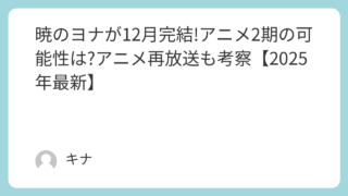 アニメ・漫画暁のヨナが12月完結!アニメ2期の可能性は?アニメ再放送も考察【2025年最新】 草凪みずほ先生による人気少女漫画「暁のヨナ」が、2025年12月19日発売の「花とゆめ」2026年2号で完結を迎えることが発表されました。2009年17号から16年にわたり連載され、2025年10月時点で累計部数は1500万部を突破している... 2025.10.30アニメ・漫画
