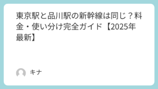 旅 東京駅と品川駅の新幹線は同じ?料金・使い分け完全ガイド【2025年最新】 東海道新幹線に乗る際、「東京駅と品川駅、どちらから乗ればいいの?」「料金は同じなの?」と疑問に思う方は多いのではないでしょうか。この記事では、東京駅と品川駅の新幹線利用について、料金の違いや賢い使い分け方を詳しく解説します。東京駅と品川駅の... 2025.11.06 旅