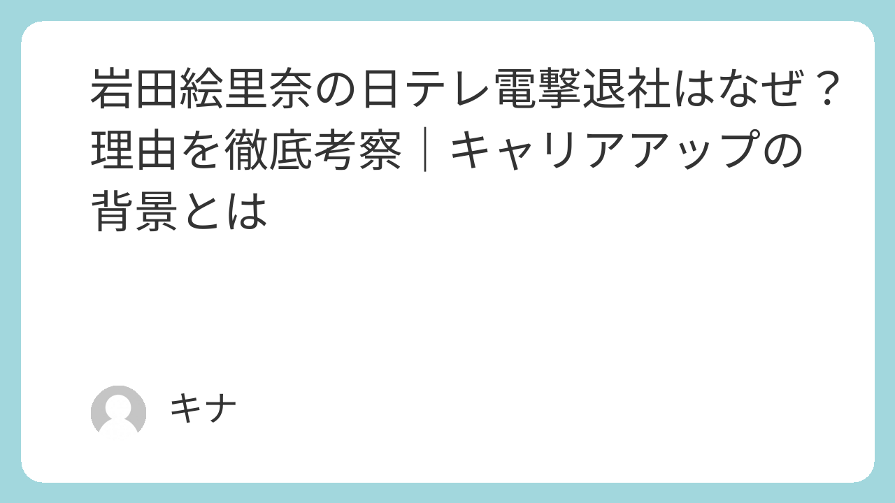 日本テレビの人気アナウンサー・岩田絵里奈アナウンサーが2026年3月をもって日テレ退社を発表。なぜ“電撃退社”となったのか、その背景と今後の展望を考察します。