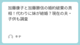 また、妹の夫が加藤勝信財務大臣(2025年現在)です。選挙区は妹の夫である加藤勝信氏が継承しています。
