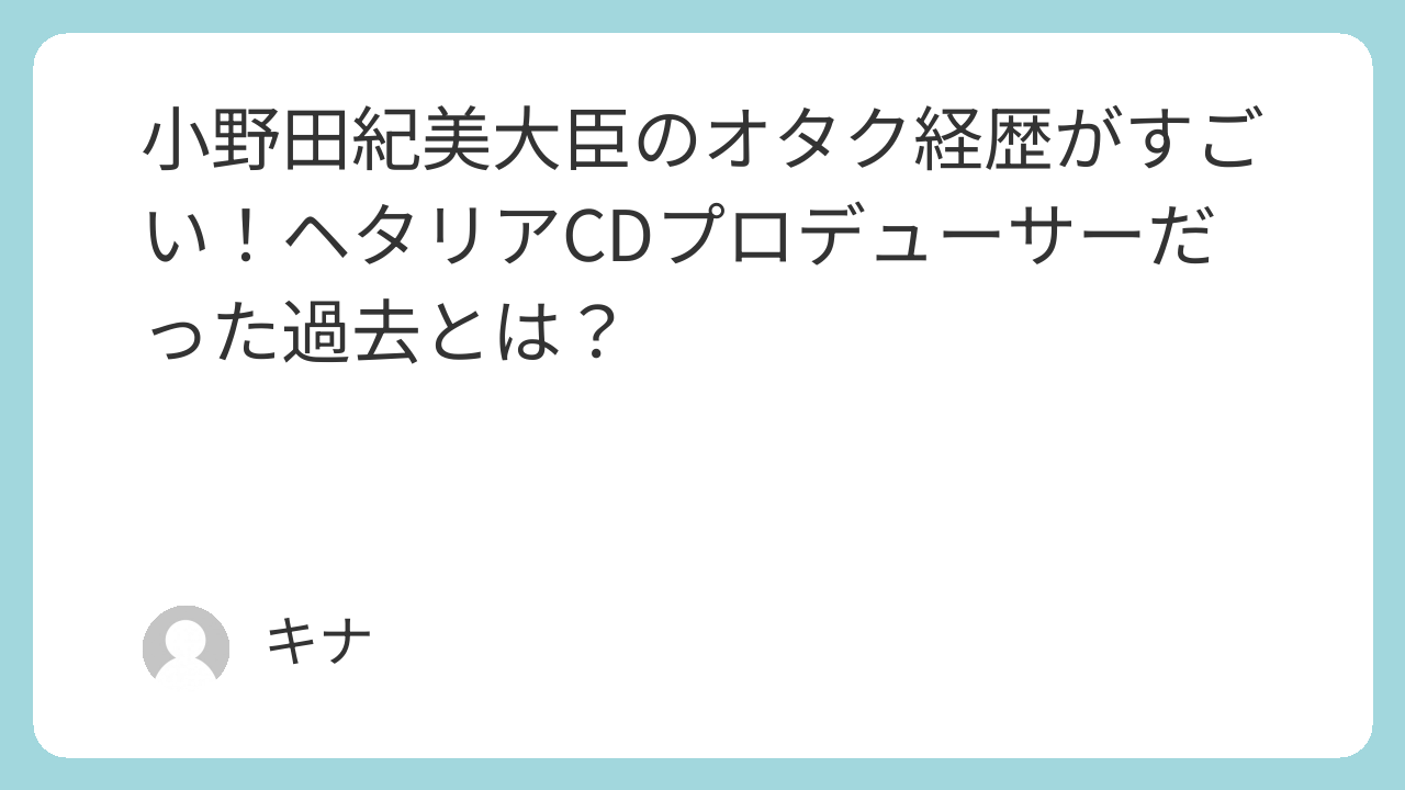 小野田大臣の「オタク」ぶりが再び注目を集めたのは、大臣就任のニュースがきっかけでした。発端は2023年5月に一般ユーザーが投稿した「ヘタリア×羊でおやすみシリーズ」のCDの写真です。