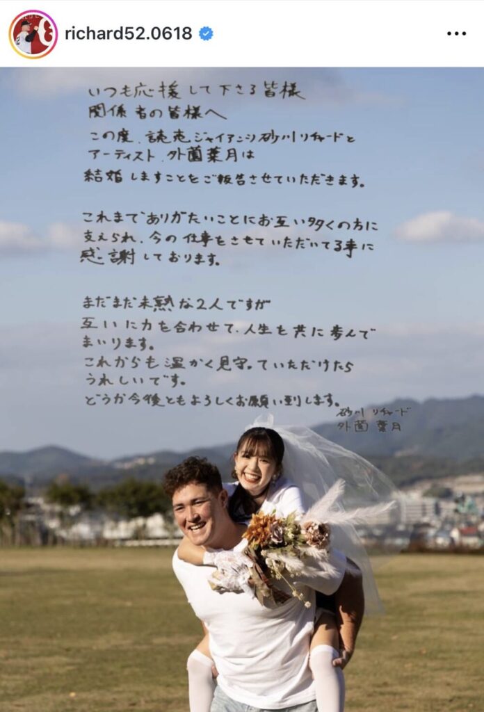 2025年11月26日、読売ジャイアンツの砂川リチャード選手と元HKT48の外薗葉月さんが結婚を発表しました。二人の馴れ初めが気になる方も多いのではないでしょうか。