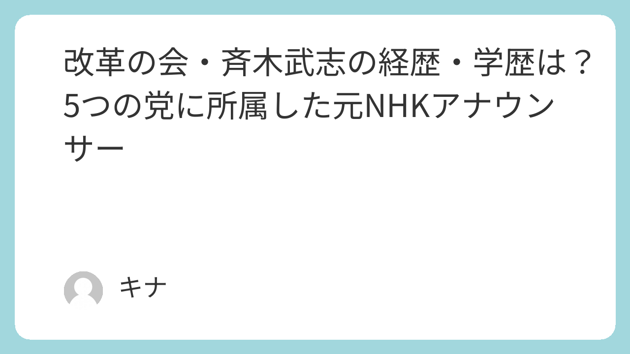 斉木武志氏は栄光学園、東京大学法学部という恵まれた教育環境で学び、NHKアナウンサーとして報道の最前線で活躍した後、政治の世界に転身しました。複数の政党を経験しながらも、一貫して国民生活の向上と政治改革を訴え続けています。