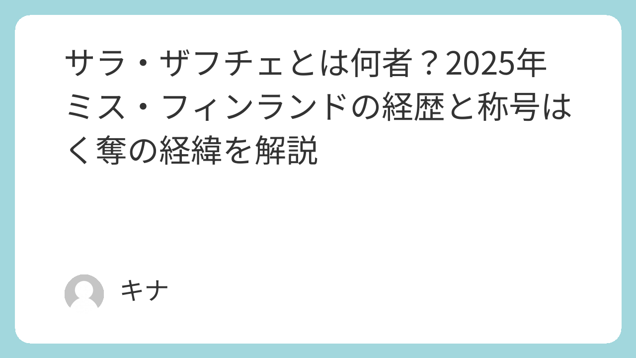 2025年12月、フィンランドの美の象徴として輝いていたサラ・ザフチェさんが、SNS上の写真をめぐって称号をはく奪されるという前代未聞の事態が発生しました。ミス・フィンランド協会が90年以上の歴史で初めて下したこの決断は、国内外で大きな波紋を広げています。一体サラ・ザフチェさんは何者なのか、そしてなぜこのような事態に至ったのでしょうか。