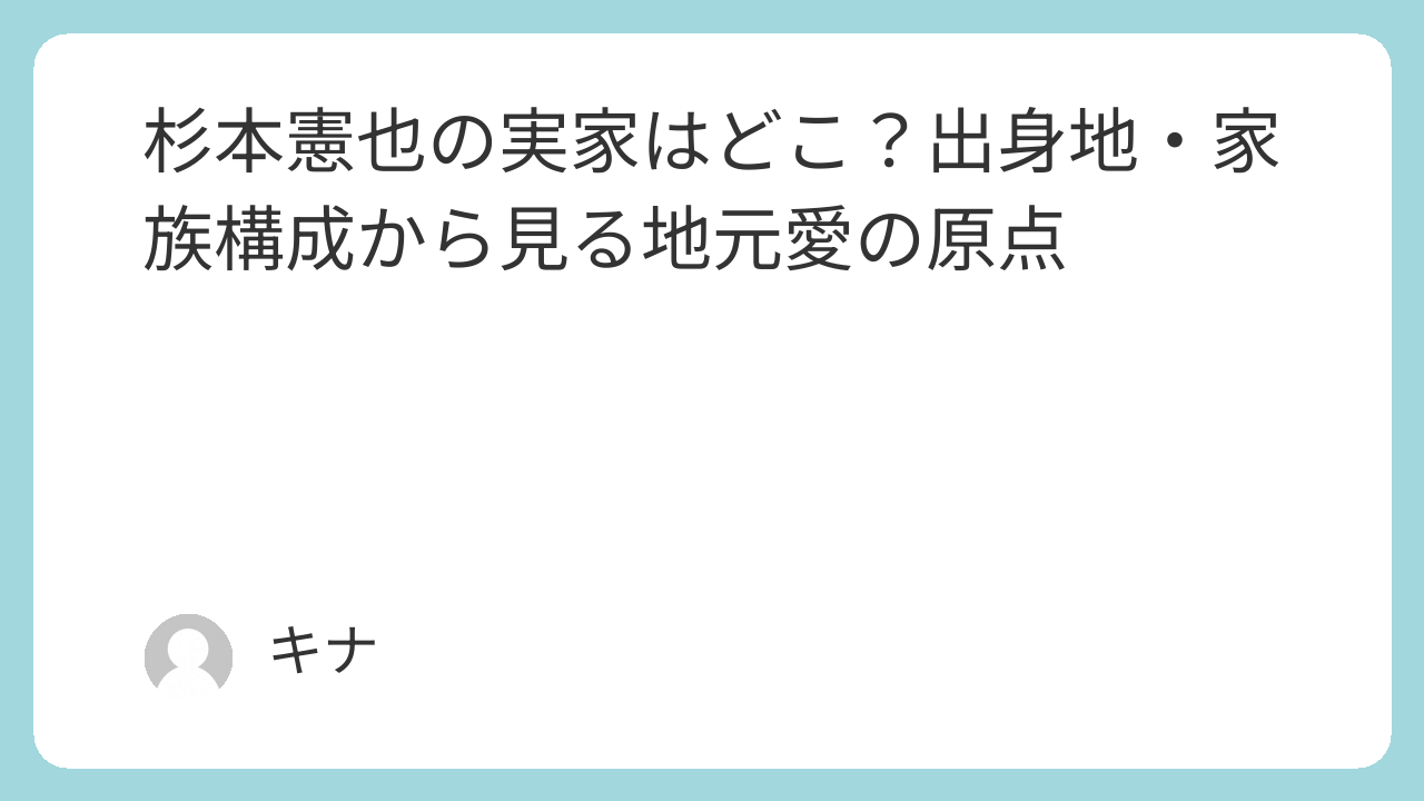 現在のところ、杉本憲也氏の実家の具体的な場所や、両親・兄弟姉妹などに関する詳細な情報は公開されていません。