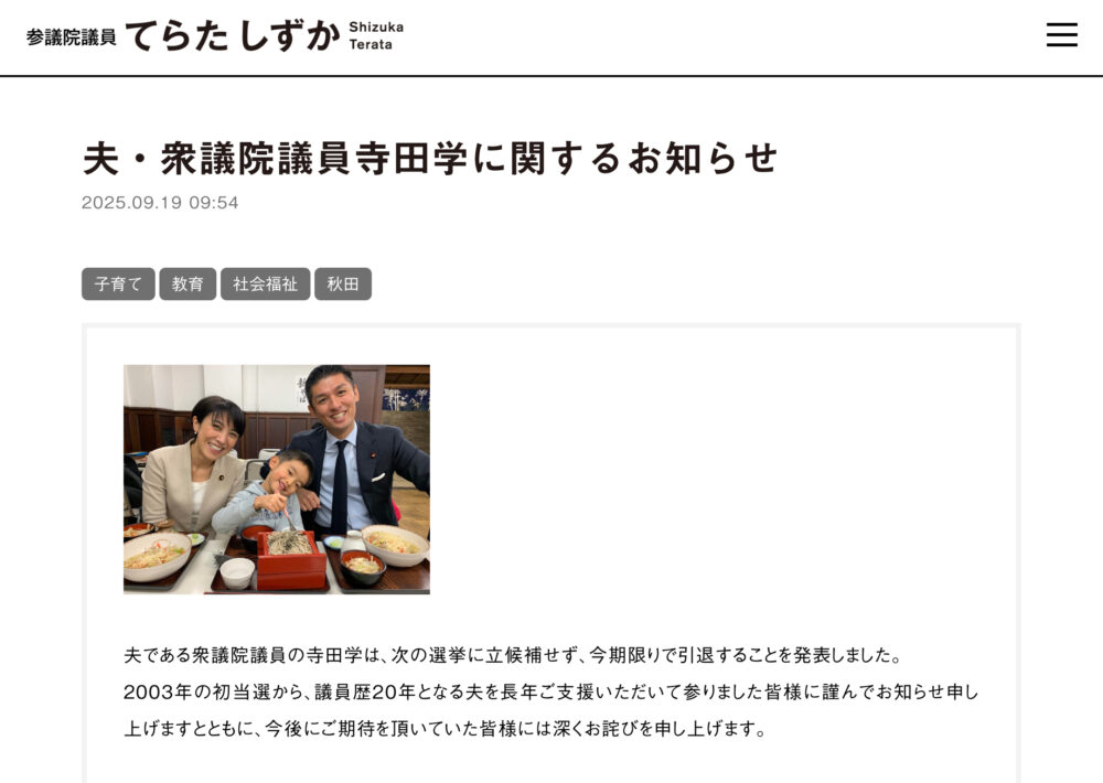 2025年9月19日、寺田学さんは「妻の政治活動を優先するため、家事や育児の負担を一層私が担う」とのコメントを公表し、政界引退を表明しました。